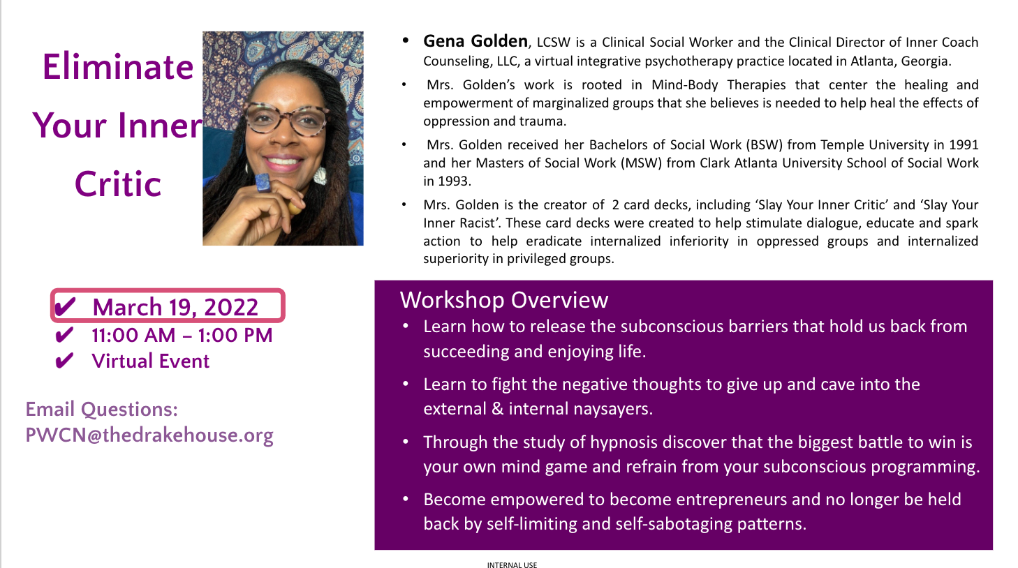 Professional Women’s Career NetworkFacilitation Topic: ‘Eliminate Your Inner Critic’